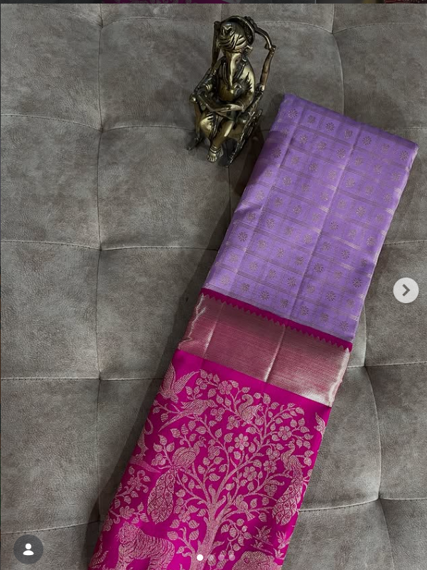 This exquisite Kanchi Pattu saree is a masterpiece of tradition and artistry. The delicate lavender body, woven with intricate golden motifs, meets a vibrant magenta pallu that comes alive with majestic animal and floral designs — from regal elephants to graceful peacocks under the tree of life.